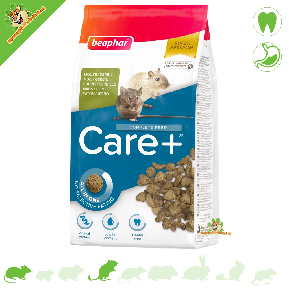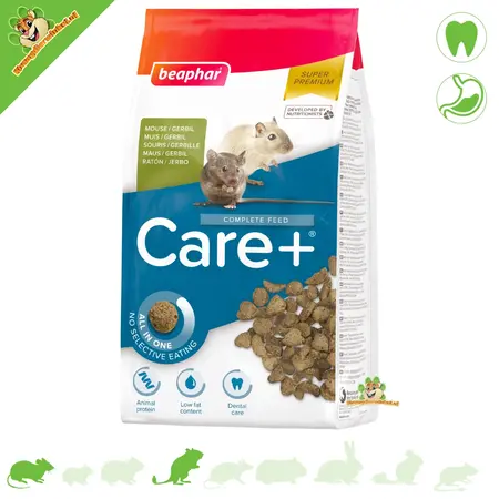 L'aliment Beaphar Care+ pour souris et gerbilles est un aliment complet pour ces animaux. Cet aliment extrudé de qualité supérieure est idéal pour les gerbilles. Chaque granulé a la même composition (tout-en-un), ce qui évite le tri des aliments. La texture dure des granulés favorise l'usure des dents.