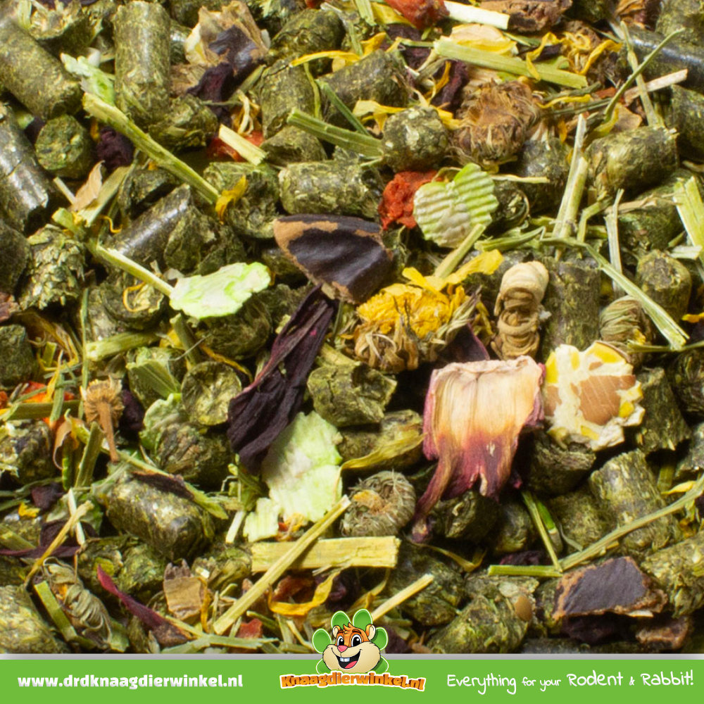 Croissance de prairies permanentes dans les contreforts des Alpes (comprenant notamment : fléole des prés, sétaire, avoine lisse, crotale, avoine duveteuse, pâturin des prés, trèfle rouge, renoncule aiguë, saule, mellifère laineux, avoine dorée, vesce à feuilles étroites, lotier houblon, pissenlit, plantain lancéolé, primevère officinale, marguerite, pimprenelle, gaillet gratteron, panais, oseille, véronique germandrée, tomentosum, ray-grass vivace, brome mou, vesce cespiteuse, arbousier, orchidée trident, renoncule globuleuse, crotale serpent, cerfeuil des bois, achillée millefeuille), flocons de pois, caroube, flocons de fèves, luzerne, betterave (3 %), persil (3 %), fleurs de souci, carottes, fleurs d'hibiscus, yucca