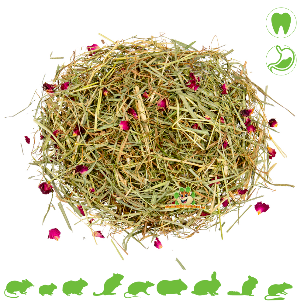 Le foin fleuri de campagne Witte Molen pour petits rongeurs herbivores et lapins vous transporte dans une époque plus simple. Du foin séché au soleil, riche en fibres, directement du pré, à un prix équitable, proposé par le Witte Molen brabançon, en activité depuis 1740. Ce foin fleuri naturel, enrichi de délicieuses fleurs de rosier, est un incontournable pour tous les lapins, cochons d'Inde, chinchillas et octodons. Des heures de divertissement garanties !