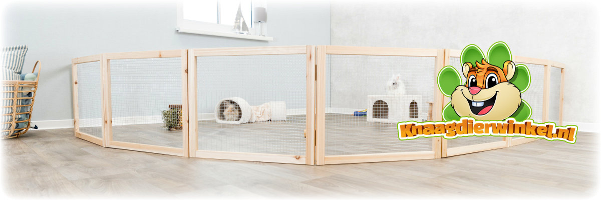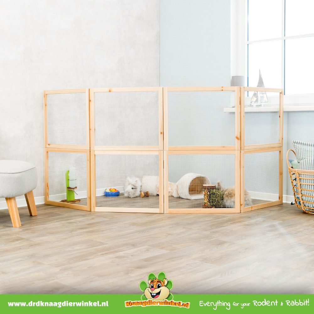 Le principal atout de cet enclos réside dans sa simplicité d'utilisation. Il suffit de monter rapidement les panneaux selon la forme souhaitée, puis d'agrémenter l'espace avec des cachettes, du foin, des jouets ou des accessoires naturels. L'enclos devient ainsi idéal pour jouer, offrir un espace supplémentaire à votre animal ou créer un coin tranquille où il peut se reposer.