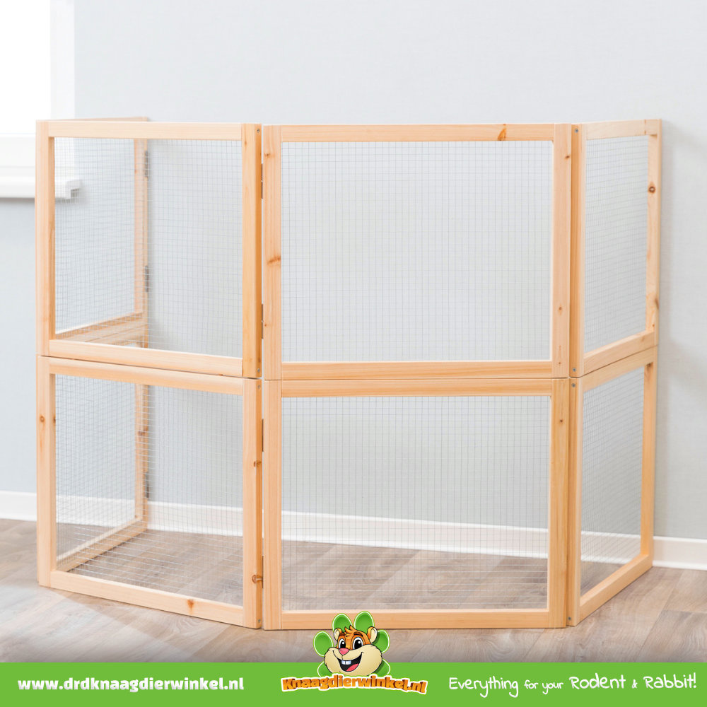 Cet enclos est particulièrement pratique pour créer un espace intérieur dégagé et sécurisé où vos animaux peuvent se déplacer, observer leur environnement et se détendre. Imaginez un coin protégé dans le salon, une aire de jeu temporaire ou un espace calme à côté de leur enclos principal. C'est précisément ce qui rend cet enclos si pratique : vous pouvez rapidement aménager un espace propre et fonctionnel sans installation permanente ni complexe.