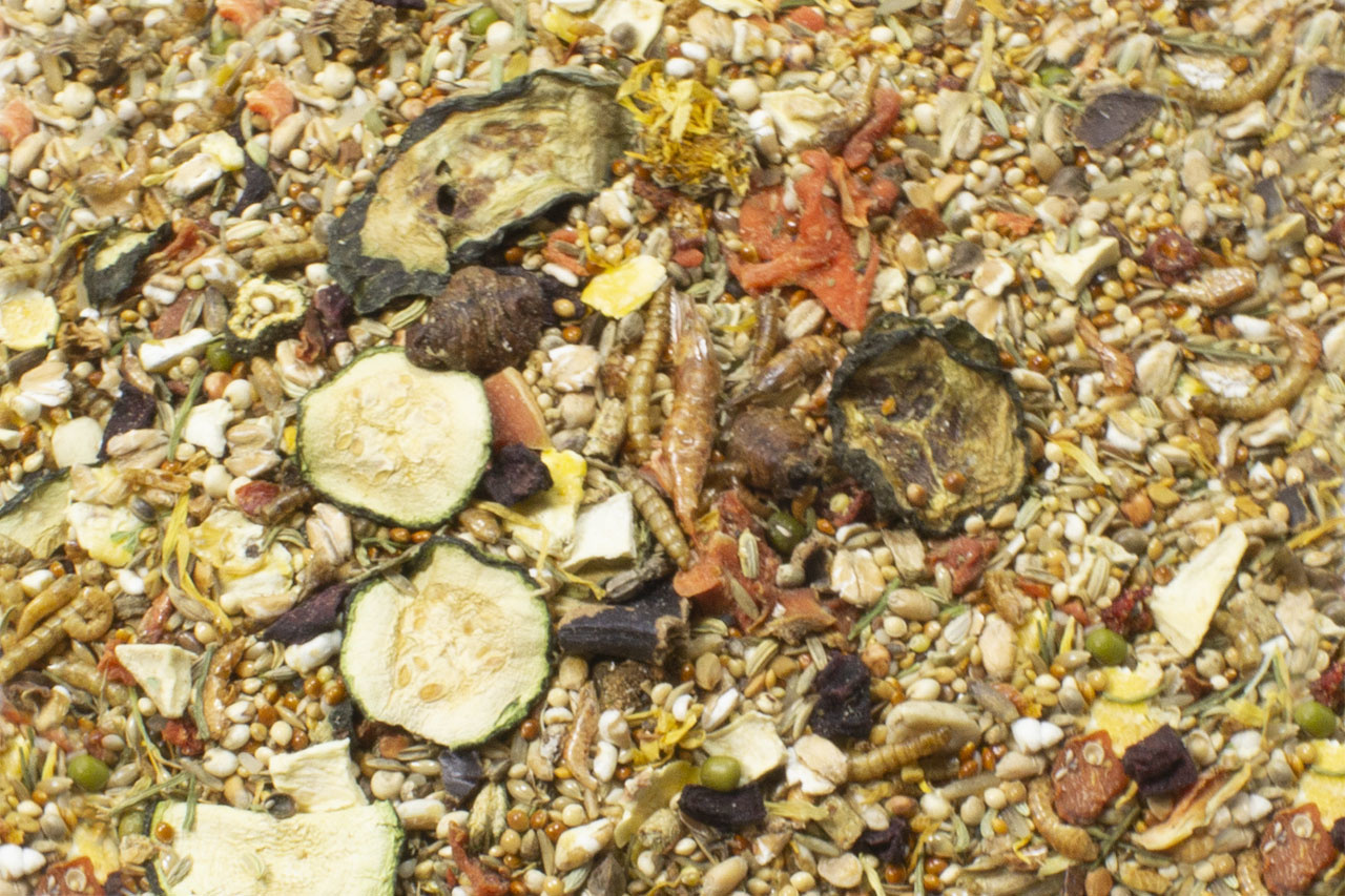 Millet Manna, millet argenté, millet La Plata, carottes, graines de phalaris roseau, graines de graminées, blé, cornflakes, flocons de blé, blé soufflé, dari, panais 2,8 %, graines sauvages (comprenant du trèfle d'Alexandrie, de l'oseille, des pâquerettes, du chénopode blanc, du millet, de la bourse-à-pasteur, de la camomille, de la renouée du Japon, des bleuets, du pavot, de la fétuque rouge, des graines d'épinards, de la violette, du mouron des oiseaux, du plantain, du ray-grass allemand, du ray-grass italien, du pâturin des prés, du sorgho fourrager), millet mohair rouge, millet du Sénégal, milo, riz, betterave, graines de lin 1,7 %, sarrasin, caroube séchée, graines de chardon-Marie, maïs, avoine, crevettes 1,3 %, graines de fenouil, germes de soja, graines d'églantier, graines de chanvre, gammares 1 %, vers de farine 1 %, graines de fenugrec. sésame décortiqué, amarante, pavot bleu, fleurs de souci, persil 1 %, chrysalides de vers à soie 0,8 %, arachides, tomate, poivron 0,5 %, courgette, concombre, cumin noir, graines de crocodile, graines de fléole des prés, graines de luzerne, graines d'aneth, yucca 0,2 %