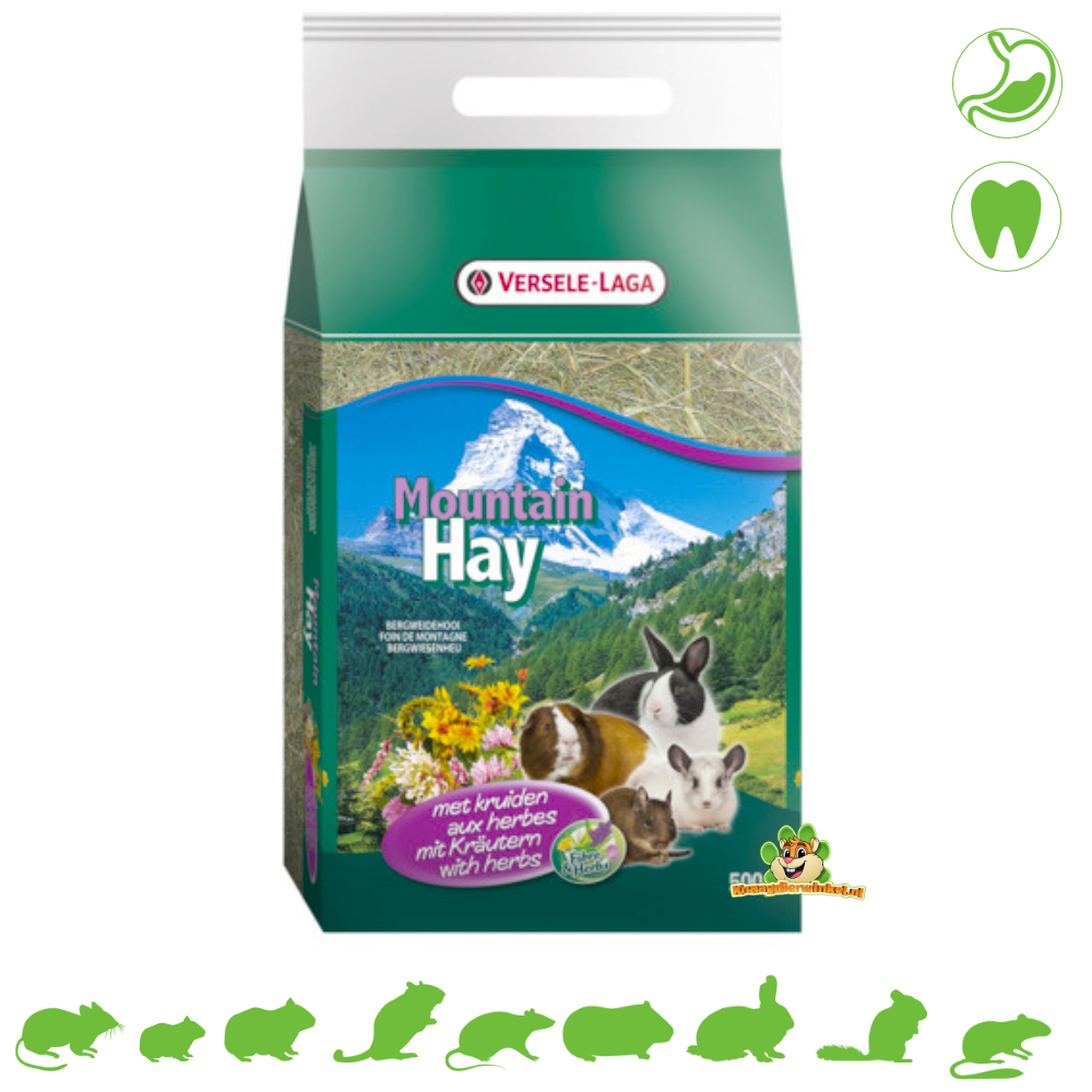 Foin de montagne - Foin de prairie de montagne aux herbes. Son origine garantit une riche diversité botanique. Ce produit 100 % naturel à l'arôme herbacé est riche en fibres (> 30 %) et favorise la digestion et les soins dentaires des lapins et des rongeurs herbivores (cobayes, chinchillas, octodons, etc.). Par conséquent, mettez toujours du foin dans l'enclos de votre lapin ou rongeur. C'est un complément idéal et essentiel à son alimentation quotidienne, et il peut être donné en quantité illimitée. Sans poussière, séché au soleil et délicieusement parfumé.