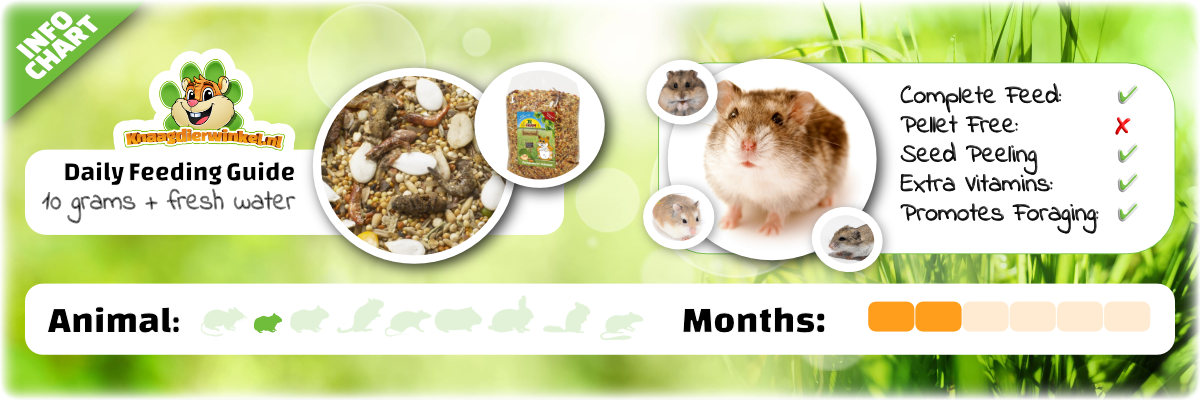Mijn dwerghamstertje smult als nooit tevoren! Geen grote, oneetbare brokken maar lekker fijn eten voor een dwerghamstertje. TOP!