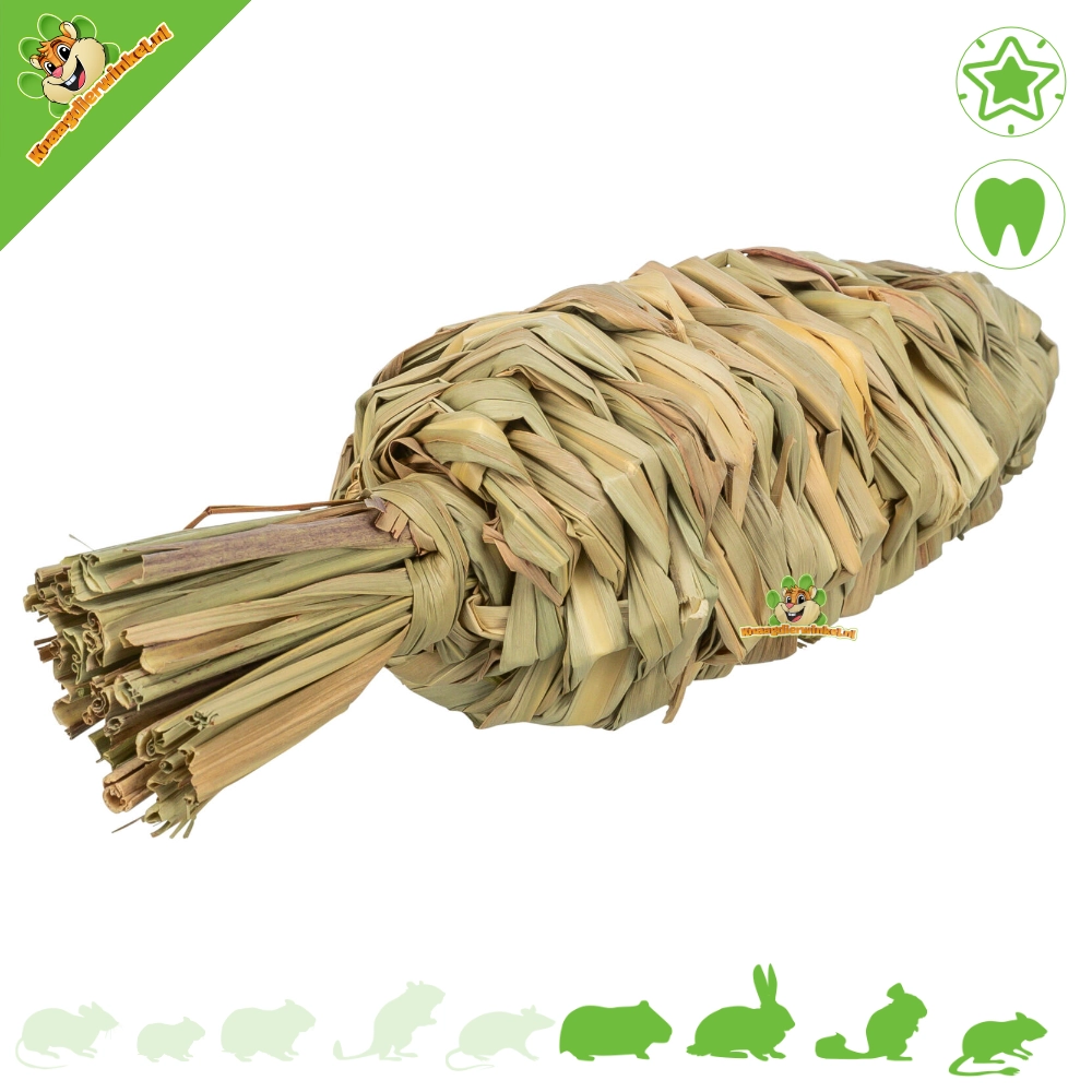 Grignoter, lancer, démolir et courir : tout est possible avec la carotte en herbe ! Composée à 100 % d'herbe naturelle, cette joyeuse carotte offre des heures de jeu et de plaisir à ronger aux lapins, cochons d'Inde, chinchillas et octodons.