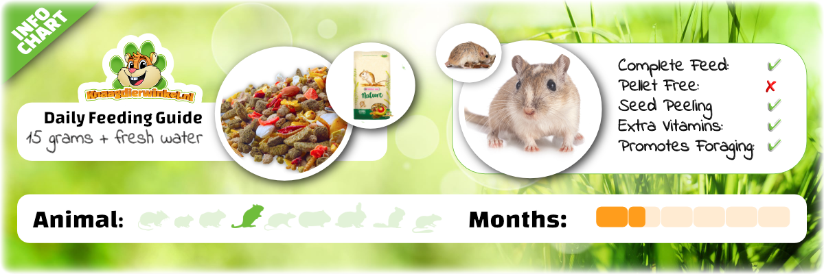 Changez quotidiennement la nourriture et l'eau. Une portion quotidienne moyenne de 10 à 15 g est recommandée pour une gerbille, selon sa taille et sa race. Complétez son alimentation avec des friandises Nature Snacks pour plus de variété.