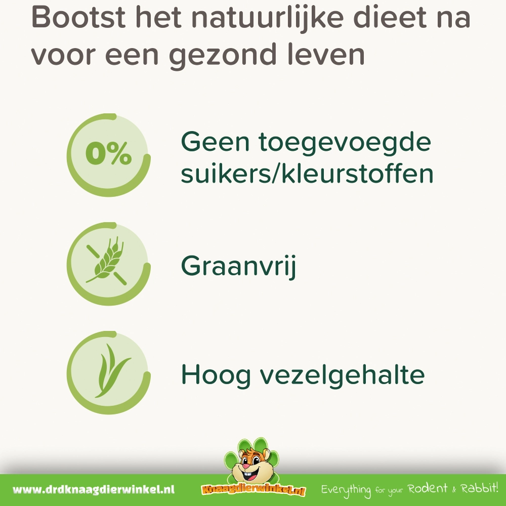 Cet aliment est riche en fibres (25 % de fibres brutes) et contient de l'inuline (une fibre prébiotique) et du yucca. Il est important de toujours associer cet aliment à du foin à volonté, de l'eau fraîche et des légumes frais chaque jour : le foin reste l'élément principal de son alimentation.