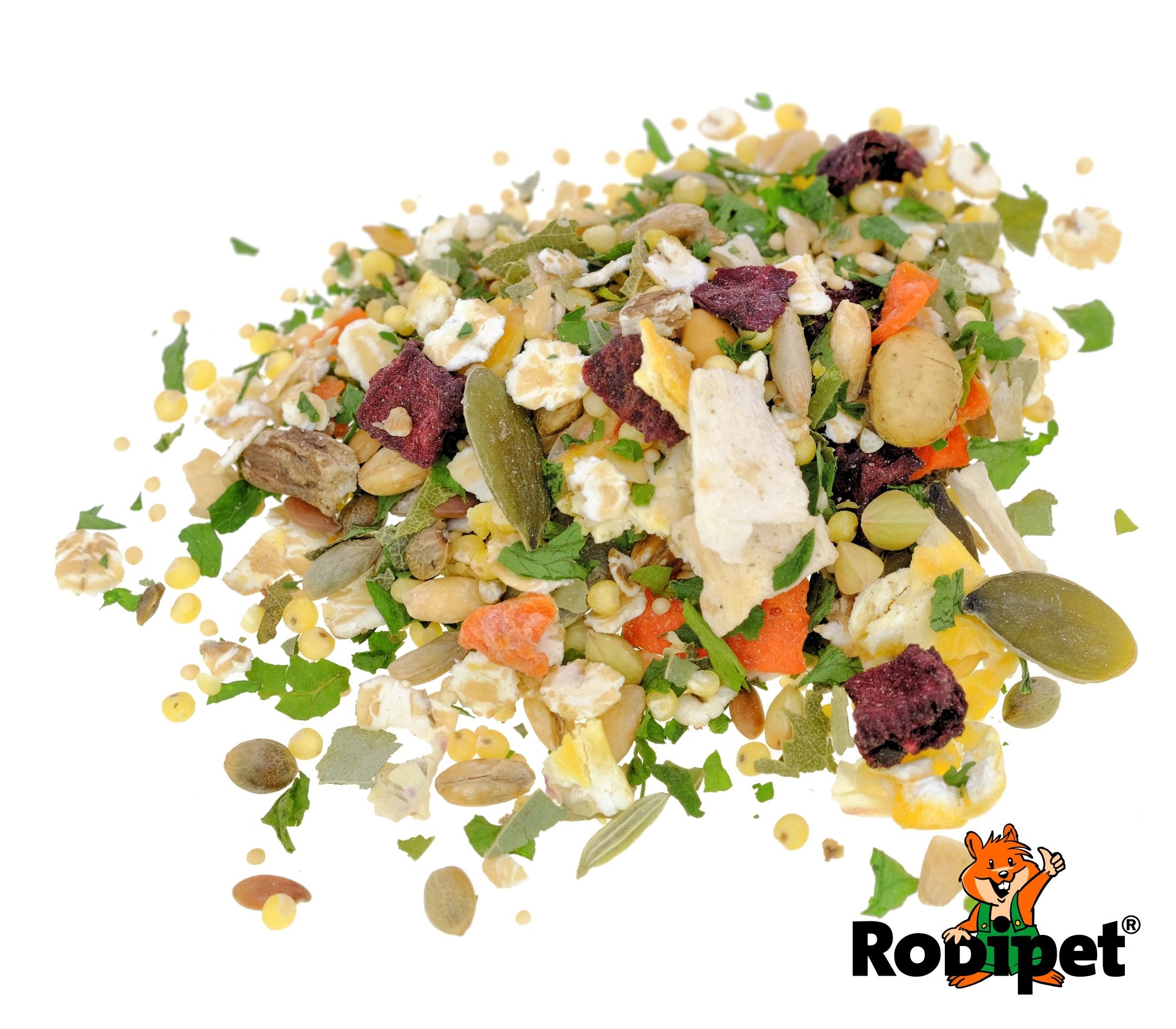 Ce produit ne contient pas de vitamines ajoutées. Rodipet recommande donc de le compléter avec des protéines animales, des herbes et des légumes frais.