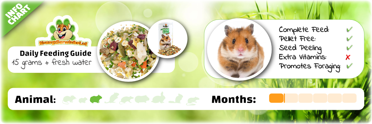 Mijn Syrische hamster vindt het heerlijk! Hij wilt niks anders en doet het er goed op! Vergeet niet wat dierlijke eiwitten erbij te doen, bijvoorbeeld meelwormen of vlokreeftjes. Raad het zeker aan!