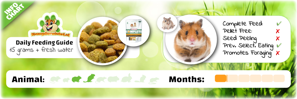 Mijn dwerghamster is er dol op, ik geef ook hamster’muesli’ maar ze eet beide! Kan je ook goed vermalen met wat water tot een papje bij tandproblemen, dan krijgen ze toch nog alles binnen!