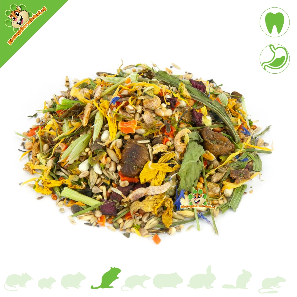L'aliment Mr. Crumble Natural Gerbil Food est un complément alimentaire spécialement conçu pour les gerbilles. Cet aliment naturel est composé uniquement d'ingrédients naturels de première qualité. Le ratio farine/graines oléagineuses est de 70/30, comme dans la nature. Le mélange contient également des graines de fleurs à petits grains, différentes variétés de millet et quelques graines plus grosses en guise de base. De quoi ravir votre gerbille et lui donner envie d'une délicieuse friandise. Fleurs et herbes aromatiques, associées à des ingrédients sains, complètent ce mélange exquis.