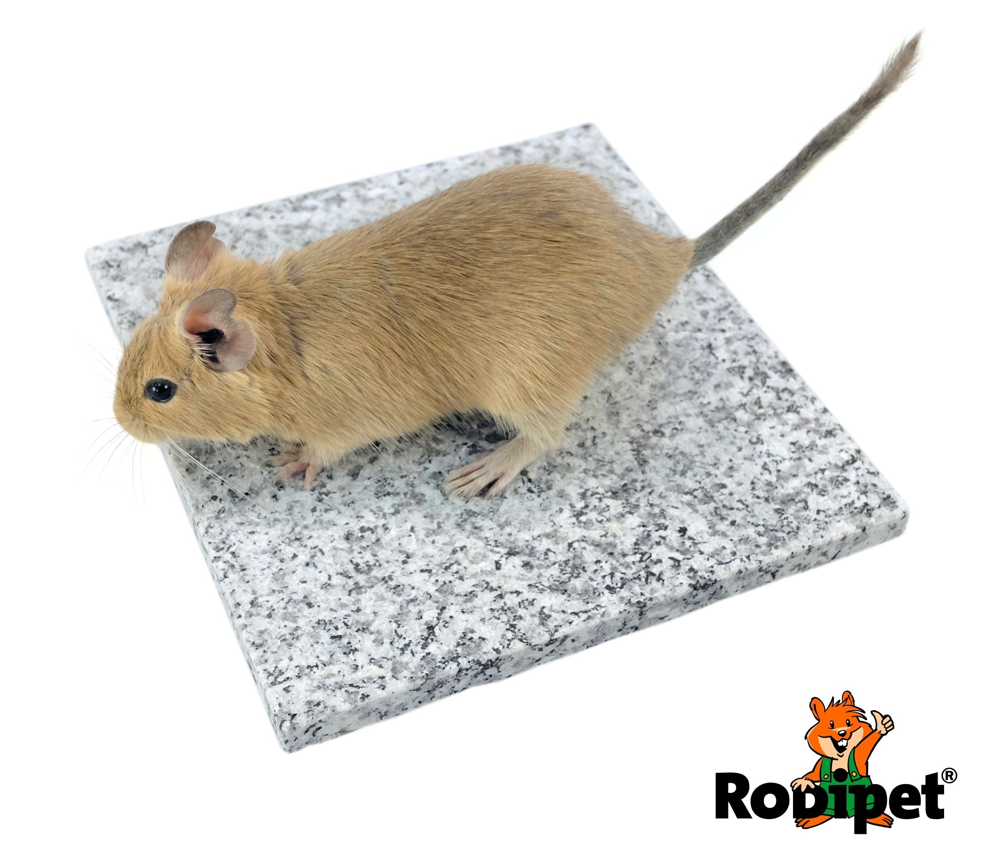 Les rongeurs n'ont qu'une faible limite de tolérance à la chaleur. Dans la nature, les animaux se retirent dans le terrier souterrain rafraîchissant lorsqu'il fait chaud - vous pouvez imiter cet effet dans la cage avec la pierre de granit ! Astuce pour les journées chaudes : lors des journées particulièrement chaudes, vous pouvez augmenter considérablement l'effet de refroidissement en faisant couler quelques gouttes d'eau sur le toit en granit.
