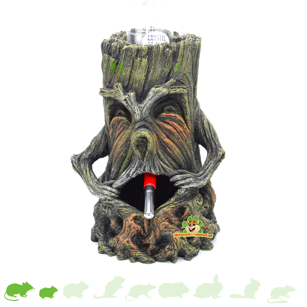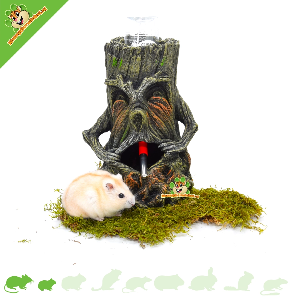 Ce magnifique tronc d'arbre peut servir de porte-bouteille ! Conçu à l'origine comme objet de décoration, il s'avère aussi très pratique. Du fait de ses ouvertures, nous recommandons de l'utiliser uniquement pour les souris et les hamsters nains. Ainsi, la bouteille d'eau est bien protégée des rongeurs et le tronc devient un bel élément de décoration. L'ouverture est placée à la hauteur idéale : le goulot de la bouteille s'y insère parfaitement, permettant aux animaux d'y accéder facilement. Il est idéal pour un habitat de hamster ou de gerbille.