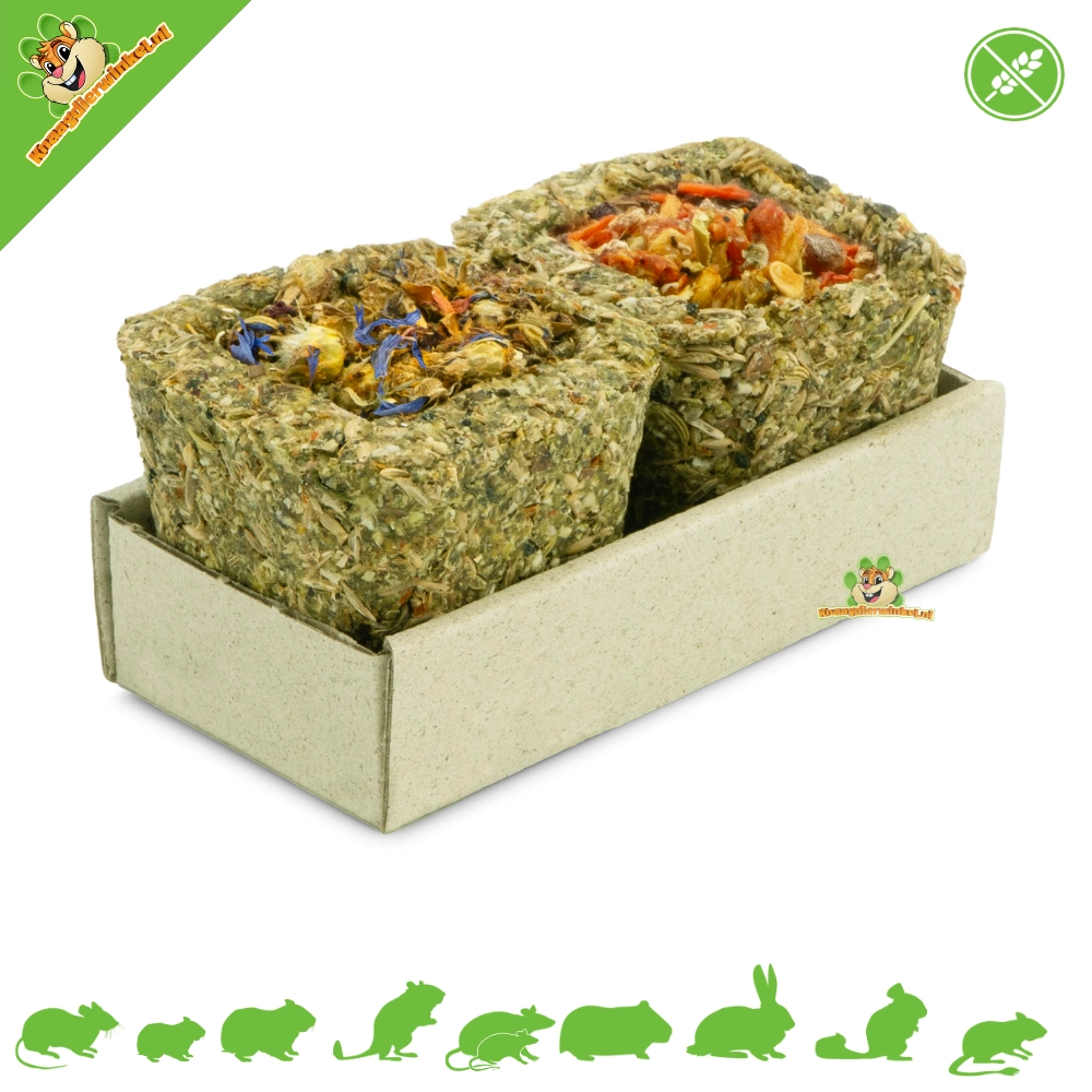 Les friandises sans céréales JR Farm sont un aliment complémentaire (en-cas) pour rongeurs et lapins. Ce lot contient deux pots à base croustillante et fourrés d'une délicieuse garniture de légumes et/ou de fleurs, comme la courgette, le panais, la carotte, le souci, la rose et le bleuet. Idéal comme petite récompense et pour enrichir l'environnement de votre animal.