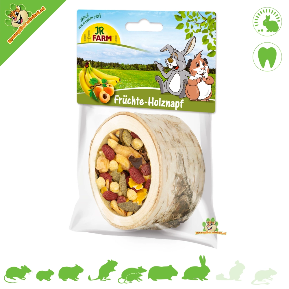 Le Pot à Fruits en Bois JR Farm est une gamelle de nourriture naturelle en bois de feuillus, idéale pour grignoter et ronger vos rongeurs et lapins. Ce pot en bois est rempli d'un délicieux mélange d'ingrédients fruités, ce qui en fait une friandise savoureuse et une activité pour vos animaux de compagnie.