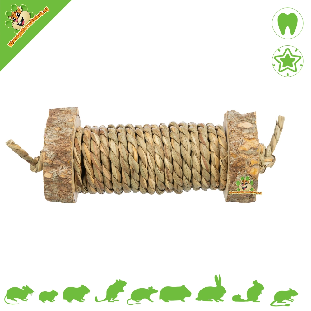 Laissez votre lapin ou rongeur grignoter et jouer avec le rouleau à grignoter en jonc de mer de 11 cm ! Ce rouleau naturel est composé d'jonc de mer et d'écorce de bois : sûr, savoureux et stimulant. Idéal pour ronger, lancer ou simplement pour distraire dans l'enclos.
