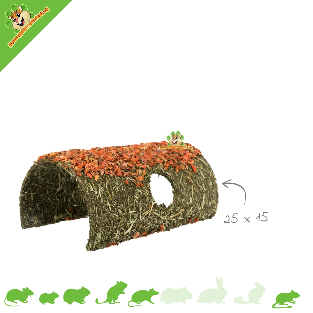 Ce tunnel de foin avec carotte est le jouet tout-en-un idéal pour votre rongeur ou votre lapin nain ! Composé de foin parfumé et de fibres végétales, il est lié à de l'amidon naturel et enrichi d'une délicieuse lamelle de carotte, parfaitement comestible et irrésistible. Idéal pour grignoter, dormir ou ramper.