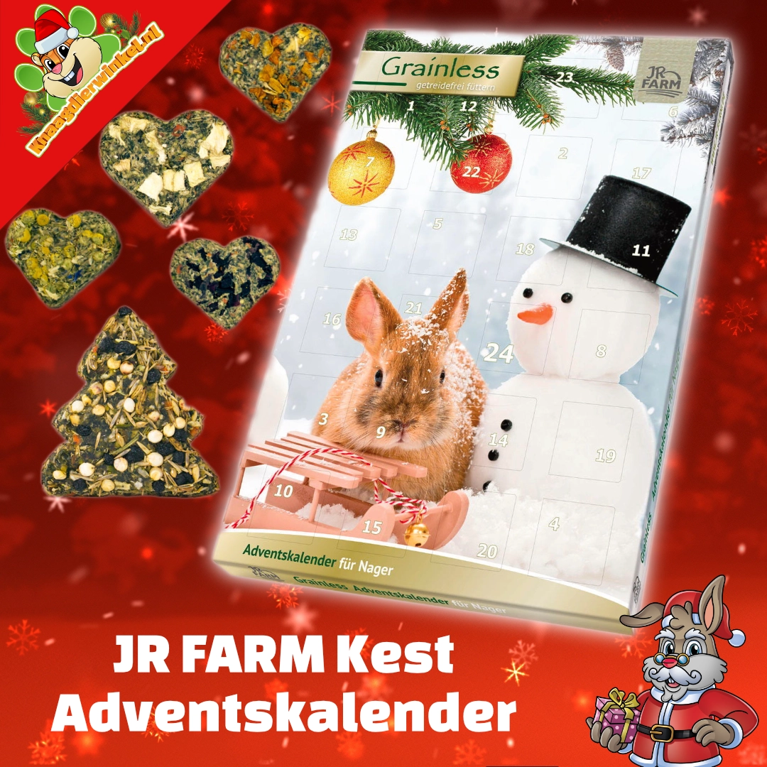 Wat is er nu mooier dan uitkijken naar Kerstmis en tegelijkertijd genieten van gezonde lekkernijen? Met de JR Grainless Adventskalender kunnen ook jouw knaagdieren aftellen naar de feestdagen met elke dag een smakelijke en gezonde verrassing. Deze bijzondere adventskalender bevat alleen 100% natuurlijke Grainless snacks, zonder granen, waardoor hij perfect past bij een graanvrij dieet. Dit maakt de kalender ook ideaal voor degoes en chinchilla’s.