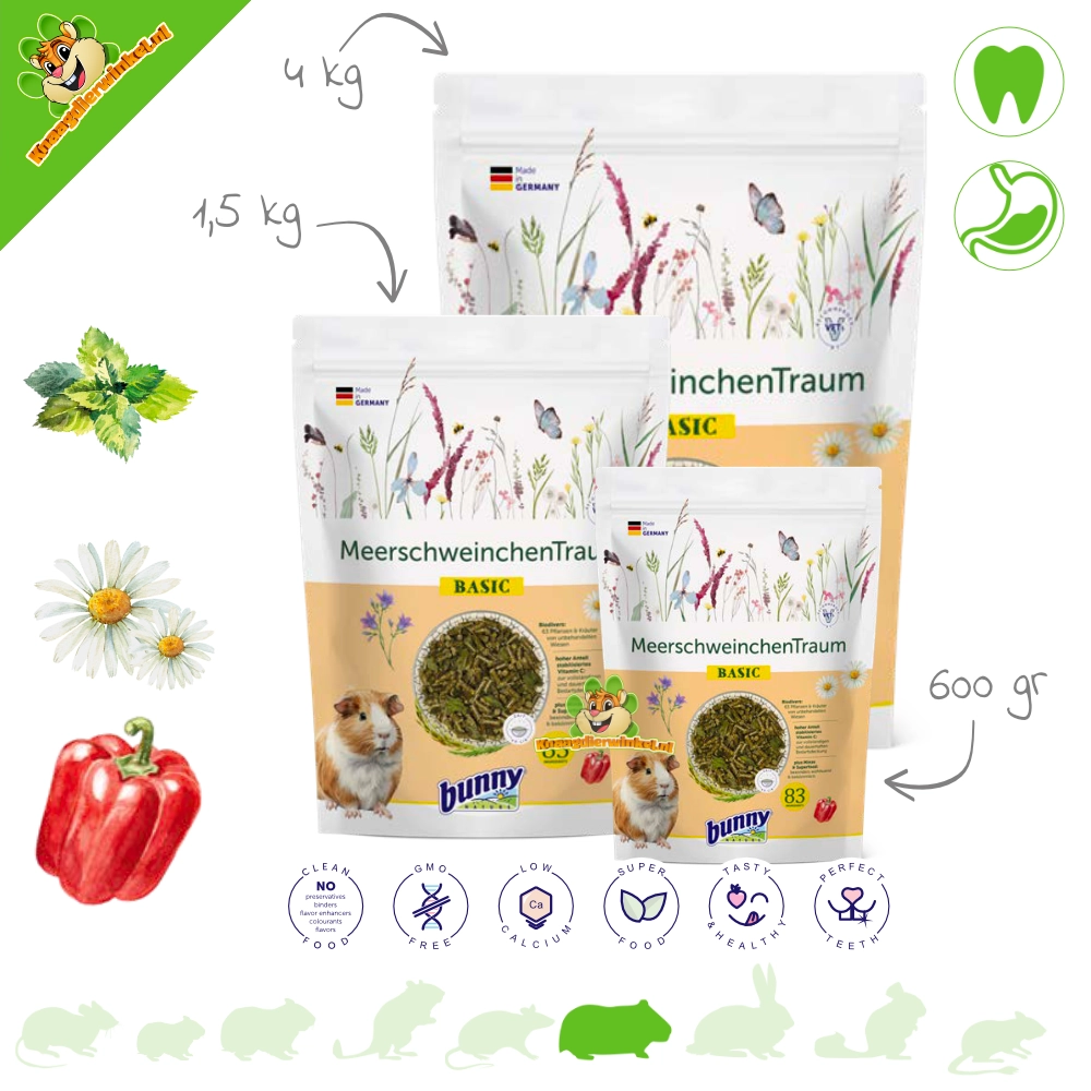 Cavia’s eten graag verspreid over de dag en hebben baat bij structuur en vezels als uitgangspunt. De brede plantenbasis (blijvend grasland) en de vezelstructuur sluiten daar goed op aan. BASIC is daardoor een fijne keuze als je één stabiele basis zoekt die je eenvoudig combineert met hooi en een dagelijks groentemoment.