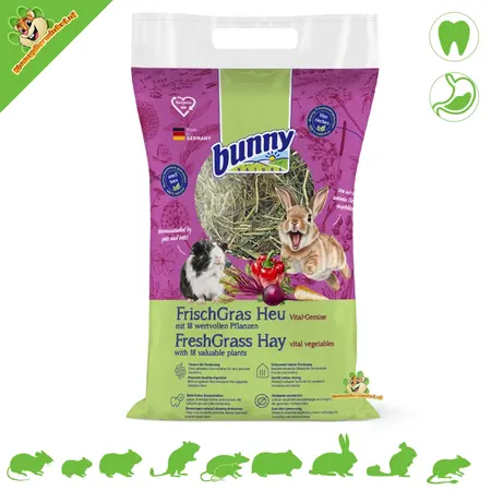 FreshGrass wordt binnenshuis gedroogd en met de hand verpakt, waardoor de sprieten langer en steviger blijven. De mix van verschillende planten en de groentetoevoeging zorgen voor extra variatie in geur en structuur.