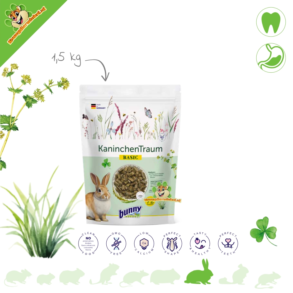 Zoek je een “vaste basis” die natuurlijk aanvoelt én praktisch is in het dagelijks voeren? Bunny Nature KonijnenDroom BASIC is een complete konijnenvoeding met een brede plantenbasis van 63 verschillende planten en kruiden uit blijvend grasland. De samenstelling is gemaakt om goed te passen bij het foerageer- en knabbelgedrag van konijnen, met veel structuur en vezels als uitgangspunt.
