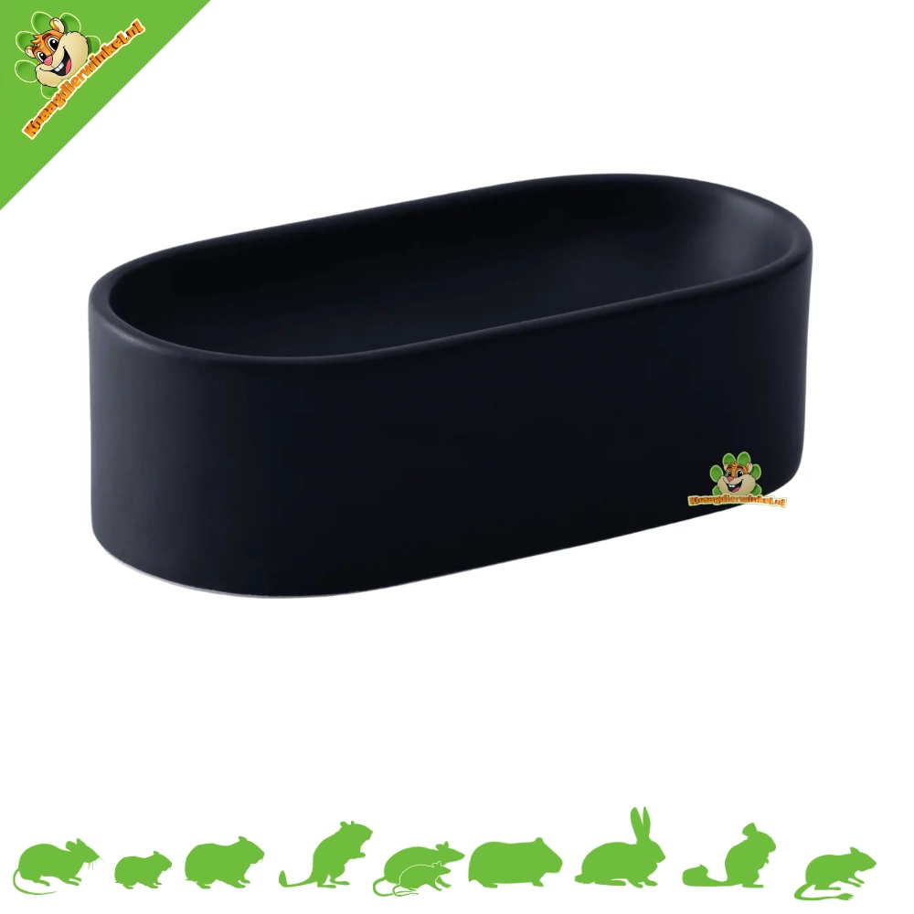 De Keramieken Eet- en Drinkbak Ovaal Zwart combineert stijl, comfort en praktisch gebruik in één veelzijdige bak. De ovale vorm maakt eten en drinken voor dieren gemakkelijker, terwijl het stevige keramiek zorgt voor stabiliteit en hygiëne. Dankzij de langwerpige vorm kunnen meerdere dieren tegelijk eten, ideaal voor grotere konijnen, cavia’s, degoes en chinchilla’s. Bovendien is deze bak ook te gebruiken als zandbak voor kleinere knaagdieren.