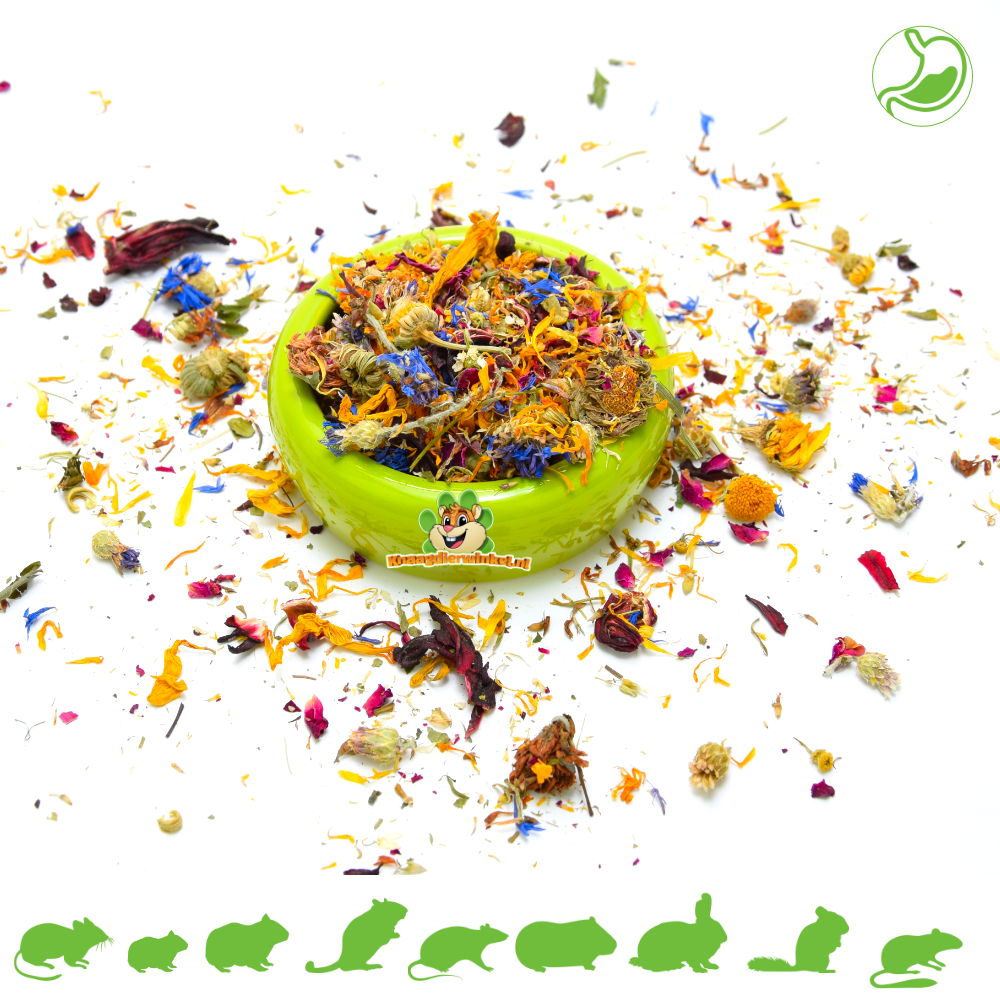 Doe jij ook aan Hamsterscaping of Gerbilscaping? Dan mag de bloemen mix niet ontbreken! Het ziet er namelijk prachtig uit als je deze her en der rondstrooit door het verblijf en de dieren hebben ook nog eens wat te zoeken en kunnen zo op een natuurlijke manier foerageren.