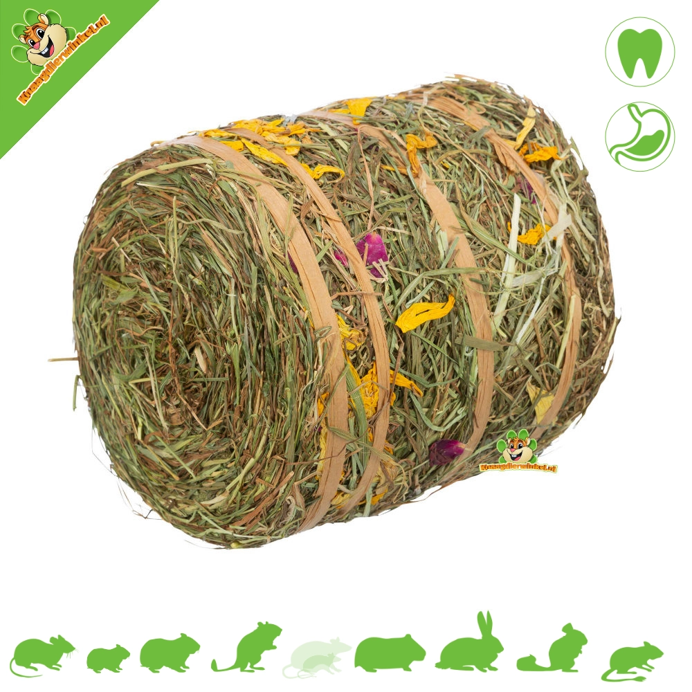 Deze heerlijke hooibaal is verrijkt met bloemen en omwikkeld met een eetbare vezelband. Het hooibaaltje bestaat uit het lekkerste weidehooi en geeft vooral herbivore knaagdieren zoals, Cavia, Konijn, Chinchilla en Degoe heel veel knabbelplezier!