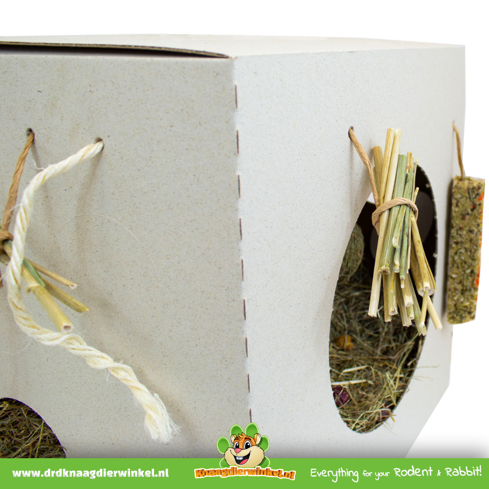 ✔ Voorgestanste openingen in de Graskarton box zorgen voor eenvoudige toegang tot het binnenste van de box, waar een geurig en vezelrijk hooi en verschillende knaag- en speelideeën wachten.