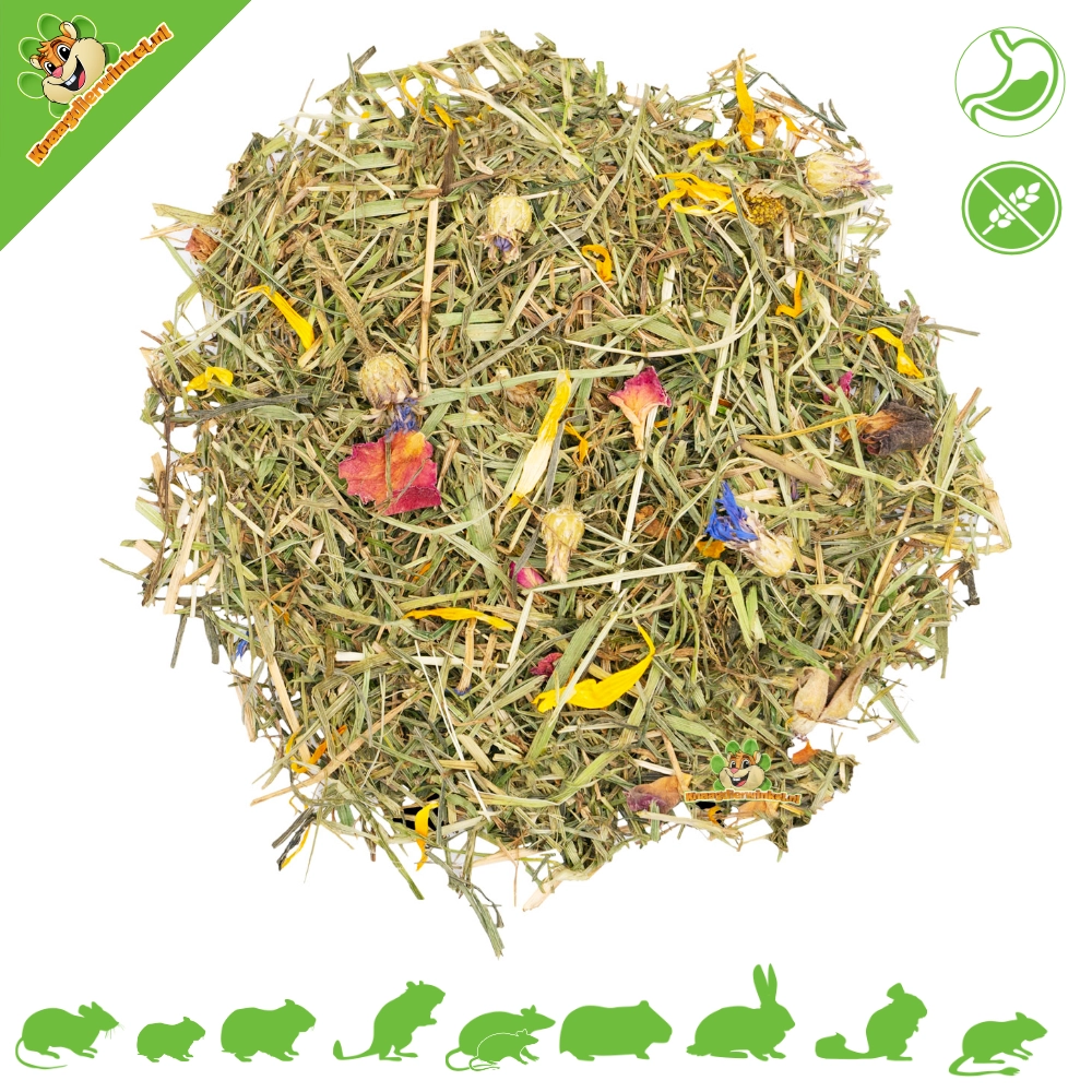 | Samenstelling: | Bergweidehooi 80%, goudsbloembloesems 10%, korenbloembloesems 5%, rozenbloesems 5% |