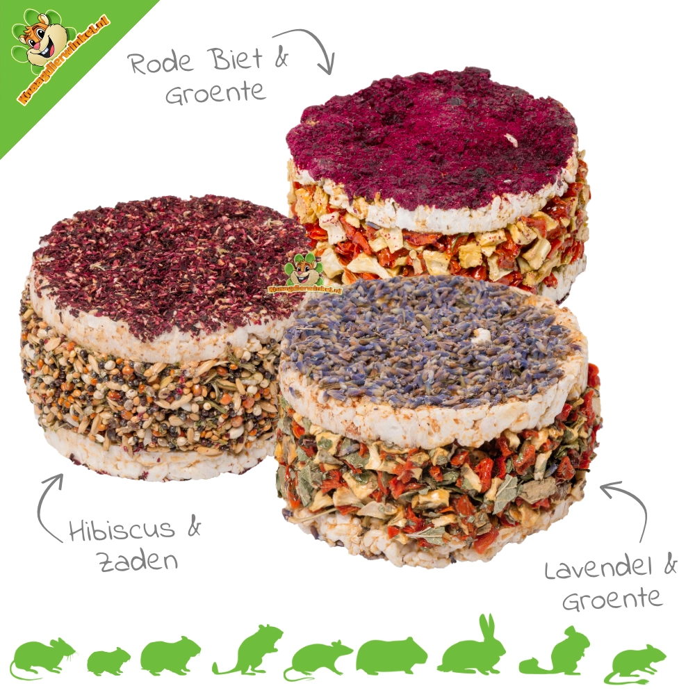 De Knaagdier Broodje Gezond-lijn bestaat uit drie heerlijke knabbelburgers die niet alleen lekker zijn, maar ook verantwoord. Elke burger is gemaakt op basis van gepofte rijst en verrijkt met natuurlijke ingrediënten zoals groenten, bloemen, kruiden of zaden. Zonder kunstmatige toevoegingen, kleurstoffen of suikers – puur natuur, precies zoals je dat graag ziet.