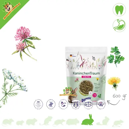 Jonge konijnen hebben andere voedingsbehoeften dan volwassen dieren. In de groeifase ontwikkelen botten, spieren, gebit en spijsvertering zich snel. KonijnenDroom YOUNG is een volledig en natuurlijk konijnenvoer, speciaal afgestemd op deze belangrijke levensfase.