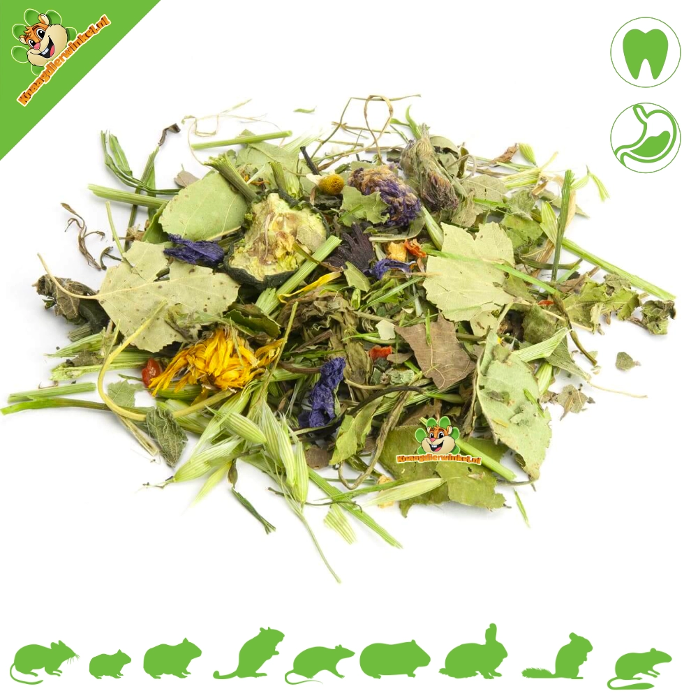 Samenstelling: 10% groene haver, 10% paardenbloem, 10% brandnetel, 10% buckhorn, 9% dille, 4% peterseliestengels, 4% berkenblad, 4% walnootblad, 3% sint-janskruid, 3% kervel, 3 % appelblad, 3% moerbeiblad, 3% gingkoblad, 2% komkommerschijfjes, 2% courgetteblokjes, 2% kamille, 2% luzerne, 2% oregano, 2% goudsbloem, 2% rode klaverbloesem, 1% pompoenblokjes , 1% wortelstukjes, 1% aardappel, 1% rode biet, 1% eikenschors, 1% munt, 1% rozemarijn, 1% hibiscusbloem, 1% kaasjeskruid, 0,5% venkel, 0,5% lavendel.