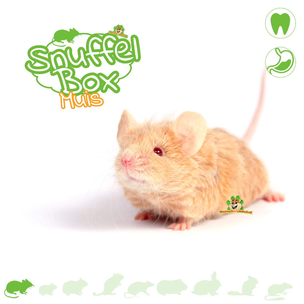 Muizen zijn nieuwsgierig, snel en altijd bezig: even snuffelen, even klimmen, even checken wat er nieuw is. Daarom is de Snuffelbox Muis zo leuk. Het is een verrassingsbox waarmee je op een simpele manier meer variatie en verrijking in het verblijf brengt. De inhoud blijft geheim, maar je mag wél rekenen op items die uitnodigen tot snuffelen, foerageren, knabbelen en actief bezig zijn – helemaal passend bij muizen.