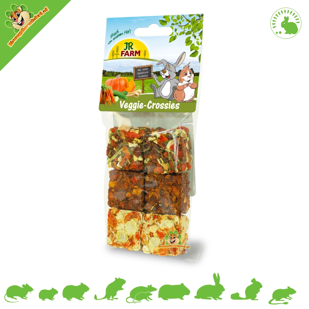 De JR Farm Veggie Crossies zijn een gevarieerd tussendoortje voor knaagdieren en konijnen! Laat je harige vriendjes genieten van een ware smaaksensatie met de JR Farm Veggie Crossies! Deze verrukkelijke groentekoekjes zijn niet alleen een feest voor de smaakpapillen van je knaagdieren en konijnen, maar ze bieden ook een scala aan gezondheidsvoordelen. Boordevol vitaminerijke wortelen, voedzame erwten en smaakvolle pompoen, zijn deze knapperige lekkernijen verrijkt met geurige peterselie, sappige tomaat en verfrissende komkommer.