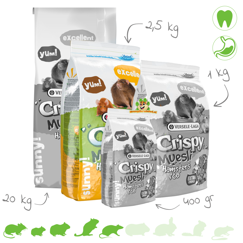 Versele-Laga Crispy Muesli Hamsters & Co to uniwersalna karma dla gryzoni, odpowiednia dla wielu małych gryzoni. Dzięki zróżnicowanemu składowi, ta kompletna karma zapewnia Twojemu małemu gryzońowi wszystko, czego potrzebuje, aby zachować zdrowie i dobrą kondycję. Chomiki i inne małe gryzonie pokochają tę smaczną i uniwersalną karmę.