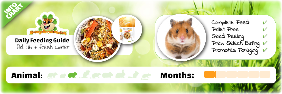 Skład karmy jest optymalnie dostosowany do naturalnych potrzeb żywieniowych chomików. Składniki są oparte na naturalnym środowisku chomika. Firma Bunny starannie przemyślała oryginalną dietę chomików, taką jaka występuje w naturze.