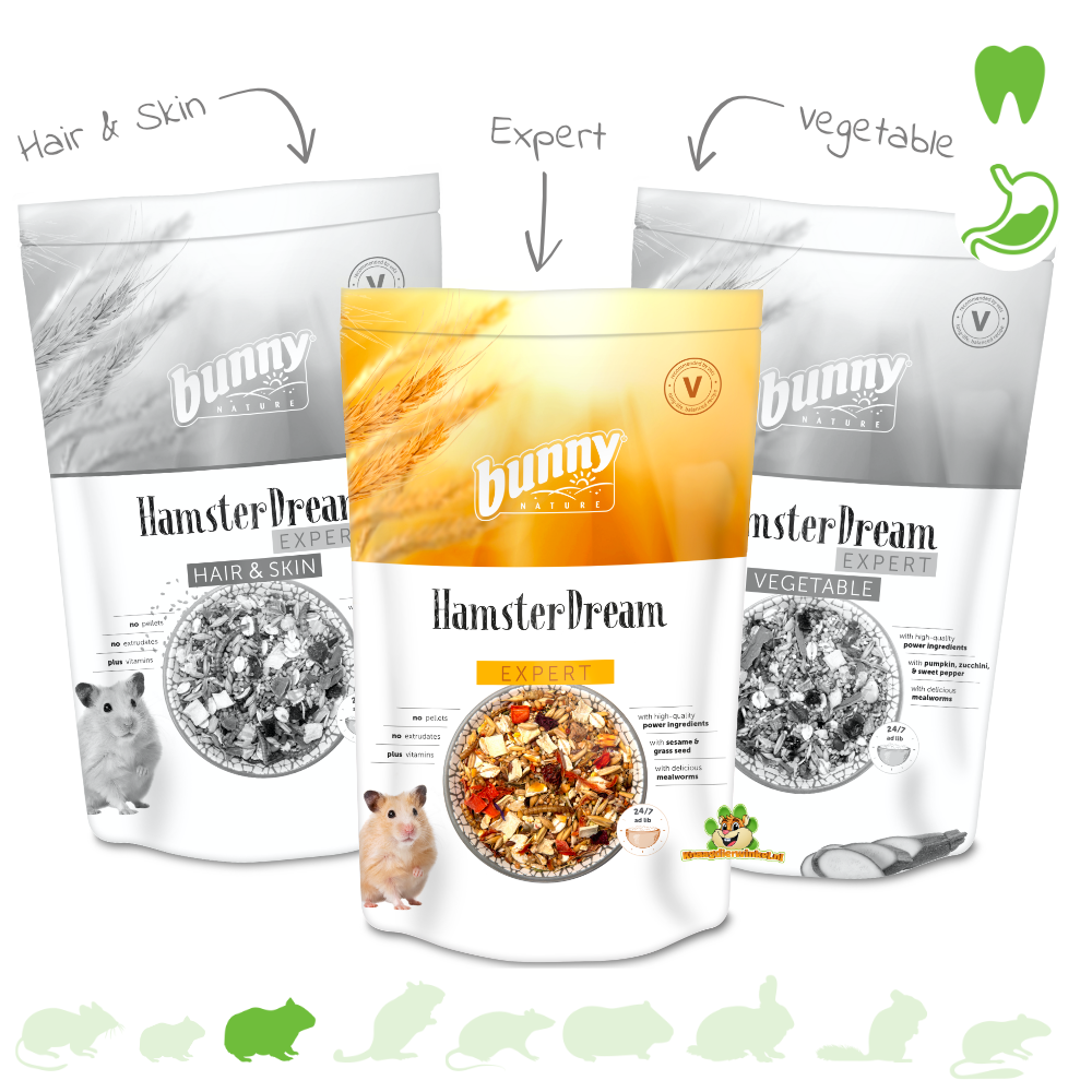 Karma dla chomików Bunny HamsterDroom Expert to specjalistyczna, bezgranulkowa, pełnoporcjowa karma dla chomików (syryjskich/złotych). Jest ekstrudowana i pozbawiona granulatu. Potrzeby żywieniowe chomików oraz najnowsze badania naukowe były kluczowe dla opracowania karmy Bunny HamsterDroom Expert.