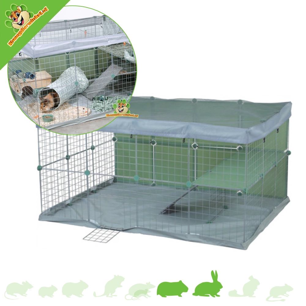 Wybieg składa się z 32 metalowych paneli, które mocuje się do siebie za pomocą klipsów. Dodatkowo w zestawie znajduje się 11 solidnych paneli, które można wykorzystać jako dodatkową osłonę ścian lub do zwiększenia praktyczności konstrukcji. W wybiegu znajduje się również jeden panel z małymi drzwiczkami, dzięki czemu królik może cicho wchodzić i wychodzić z wybiegu, gdy tylko będzie to dogodne dla Twojej konfiguracji.