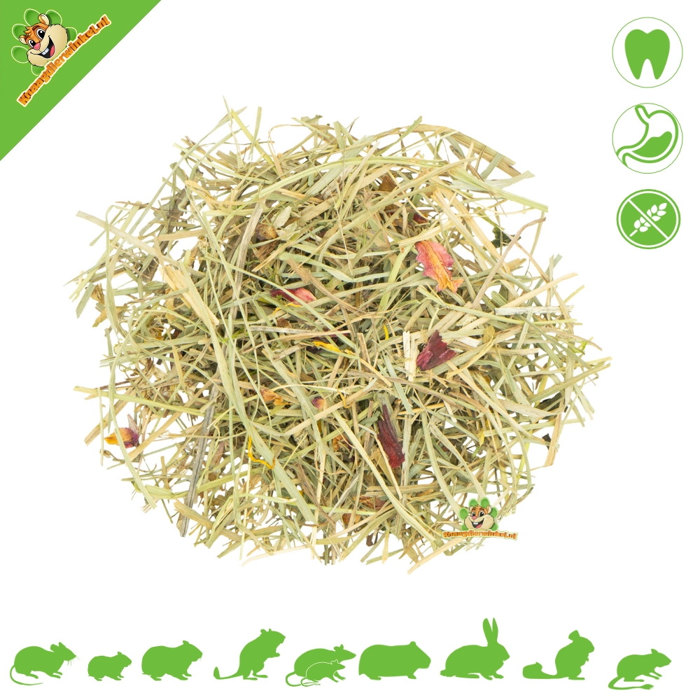 voor de bloemetjes hoef je het niet te doen. in mijn pak zat namelijk bijna geen bloemetjes. ben er maar een paar tegen gekomen. echter vond mijn konijn hops het hooi wel erg lekker en er zitten een paar van die harde stengels door die ze al helemaal fantastisch vind, dus die hield ik apart om te geven als lekkers. om die reden ga ik het ook zeker vaker bestellen.
