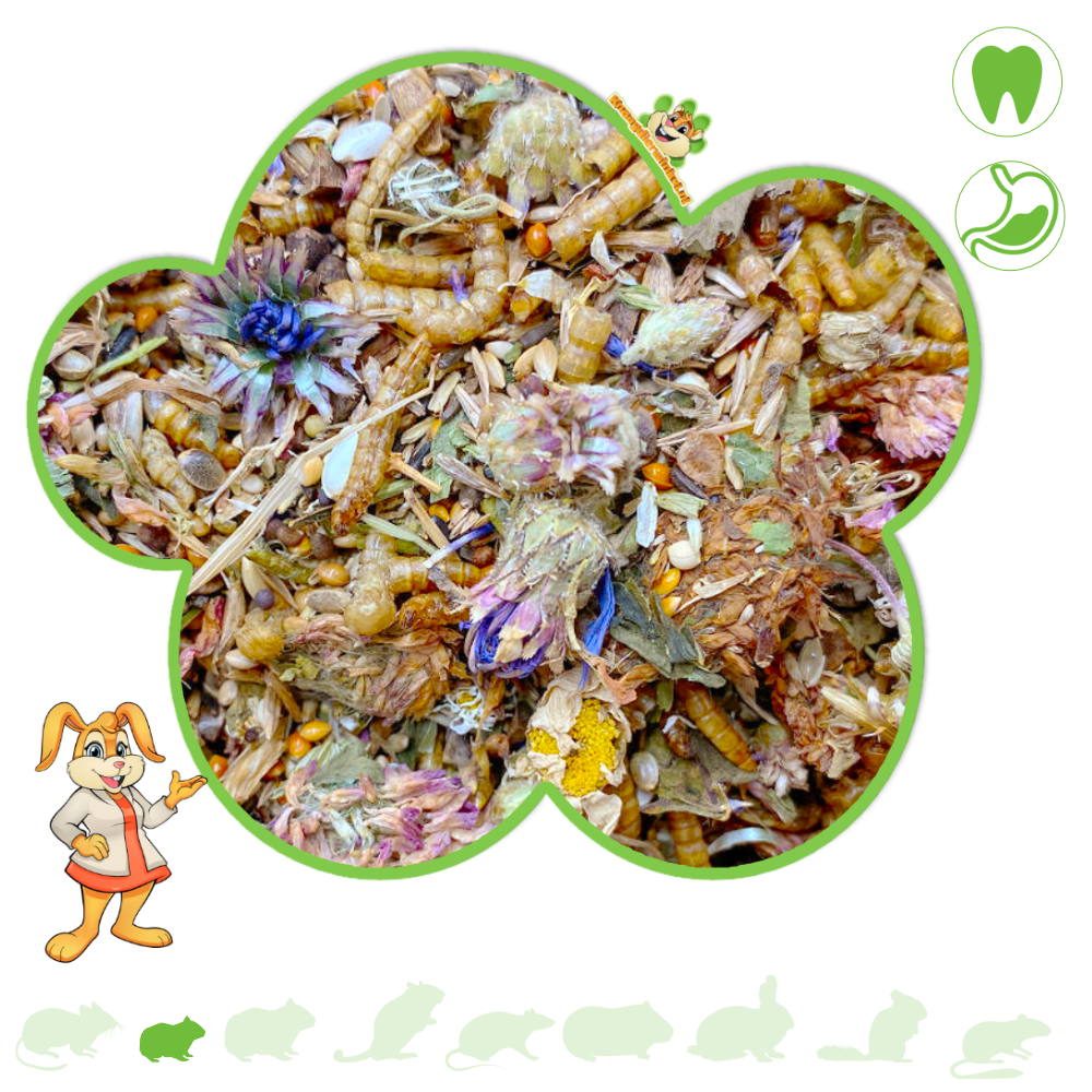 Zalecamy dodawanie 1-2 łyżeczek mieszanki karmy do kuwety dziennie, aby umożliwić zwierzętom samodzielne poszukiwanie pożywienia. Codziennie uzupełniaj mieszankę karmy świeżymi warzywami, takimi jak ogórek, cukinia, sałata i wiele innych. Dla zdrowia zwierząt unikaj owoców i suszonych owoców, ponieważ metabolizm chomików karłowatych nie jest przystosowany do wysokiego poziomu fruktozy.