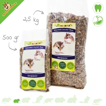 Dzikie chomiki Roborowskiego żywią się głównie nasionami roślin. Mniejszą część ich diety stanowią liście, łodygi i owady. Ta mieszanka pokarmowa to karma uzupełniająca, specjalnie dostosowana do potrzeb chomików Roborowskiego. Oprócz bogatego wyboru nasion, zawiera również dużą ilość nasion traw, które powinny wspierać ich naturalny instynkt żerowania.