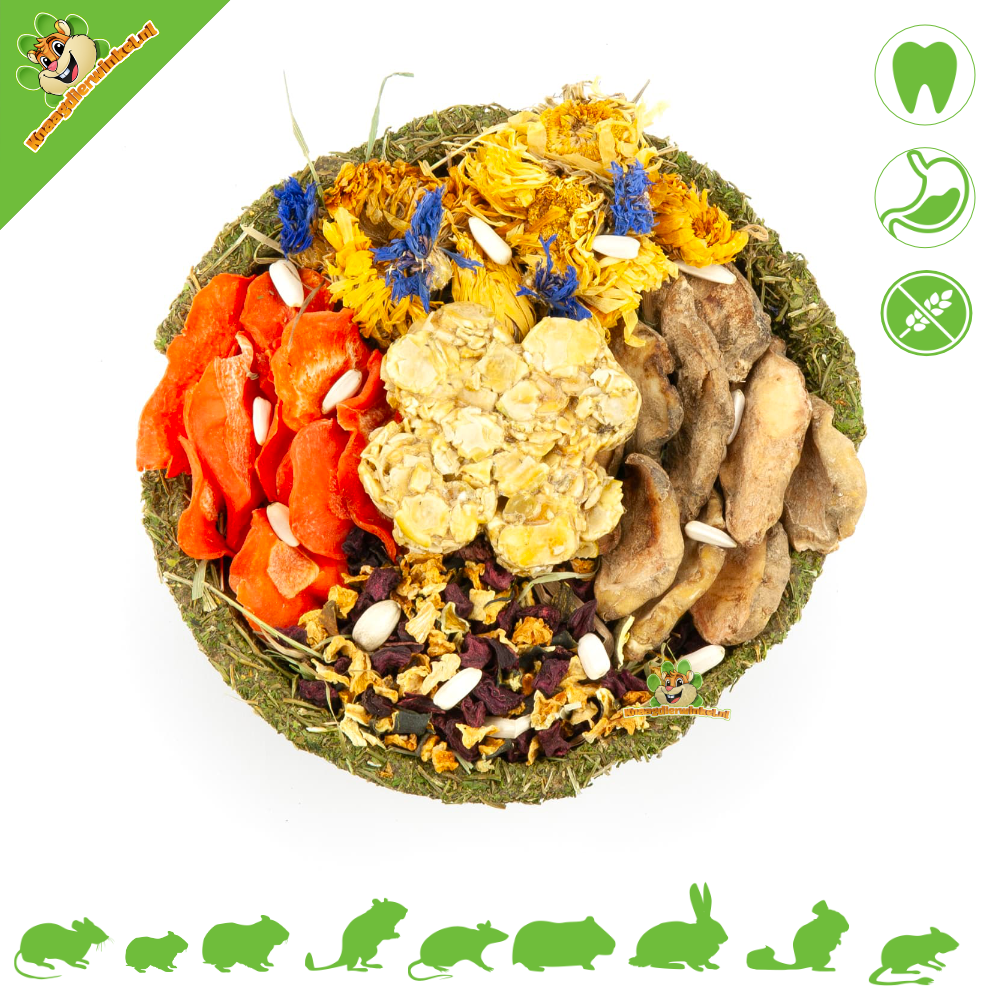 Lucky Bowl to radosna i zdrowa przekąska dla małych łakomczuchów. Miska wypełniona jest pyszną mieszanką naturalnych składników, które z pewnością ucieszą Twojego gryzonia. Od pachnącej pietruszki po kolorowe warzywa i kwiaty – ta miska to impreza w zagrodzie i zdrowy dodatek do codziennego menu. Sama miska jest wykonana z naturalnych włókien, dzięki czemu nadaje się również do jedzenia!