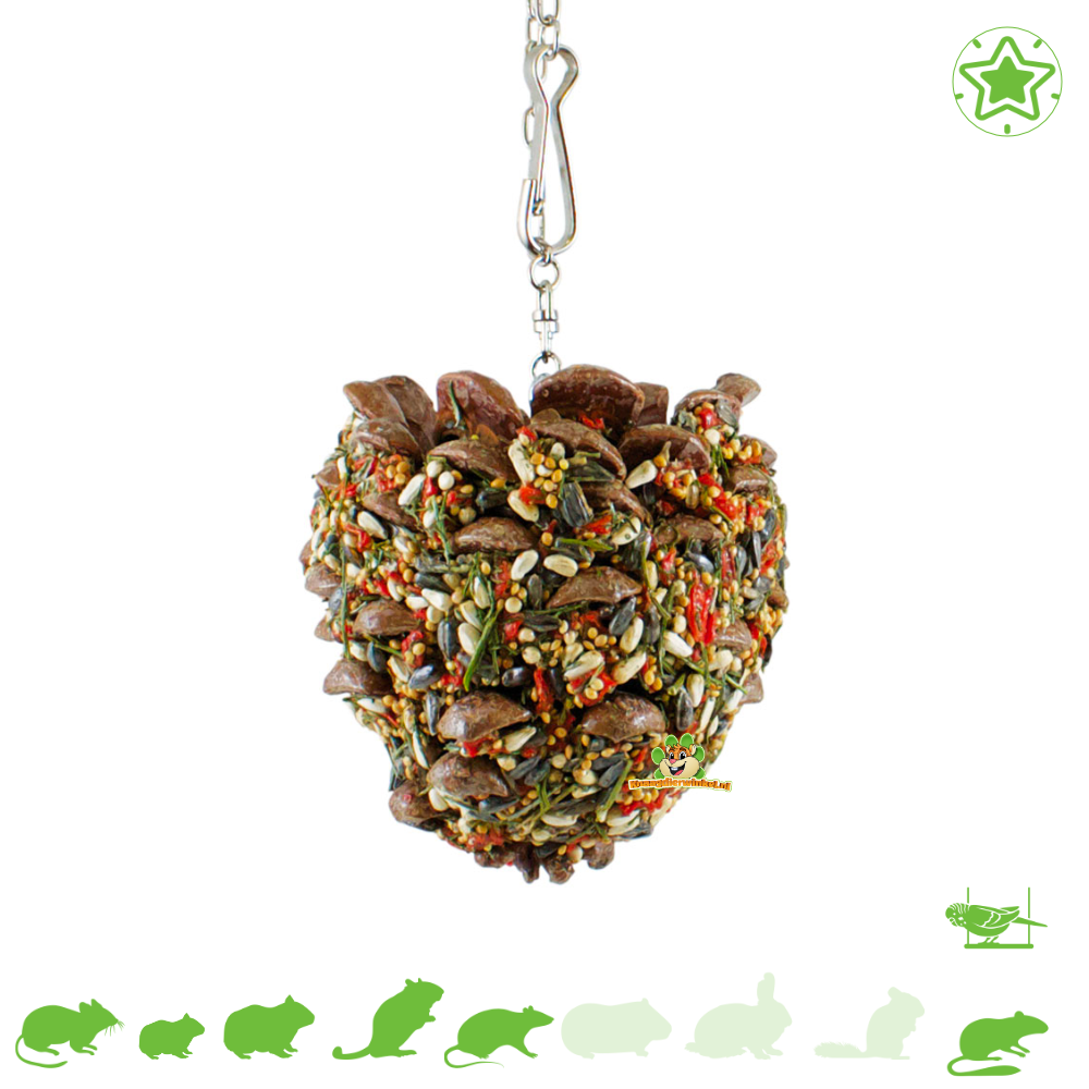 Skład: | Szyszka, nadzienie (nasiona słonecznika, nasiona krokosza barwierskiego, proso La Plata, marchew 15%, dari, pietruszka 3,7%) |