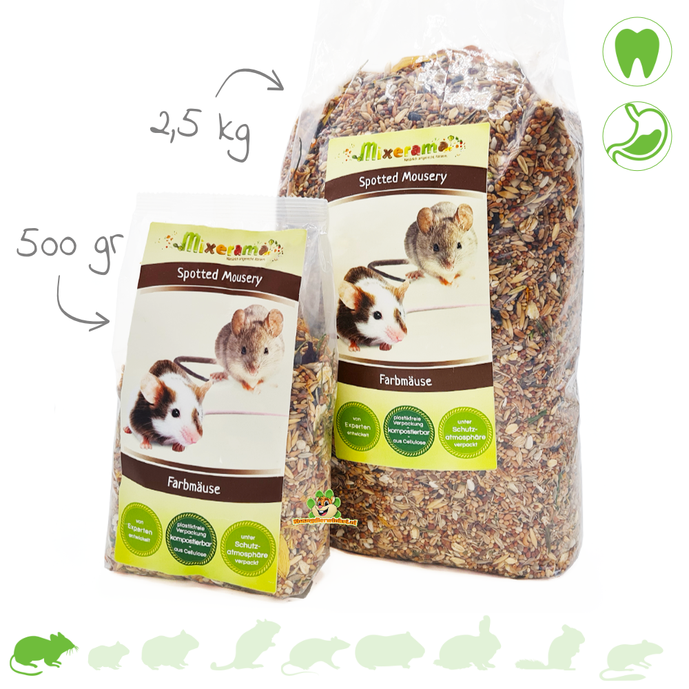 Mixerama Spotted Mousery Mouse Food to kompletna karma dla zwierząt domowych opracowana tak, aby zaspokoić wszystkie potrzeby żywieniowe myszy cętkowanych. Jest uważana za zbilansowaną i kompletną karmę, ponieważ zawiera już białko zwierzęce. Karma składa się z 77% nasion mączystych, 18,6% nasion oleistych, 2,5% białka zwierzęcego, 0,7% kwiatów, 0,7% ziół i 0,5% warzyw.