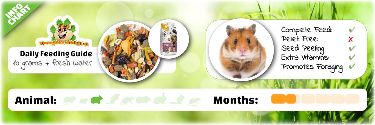 De puur hamster mix is erg fijn ik zal hem vaker gaan kopen en gebruiken als vaste voeding voor mijn dwerg hamster