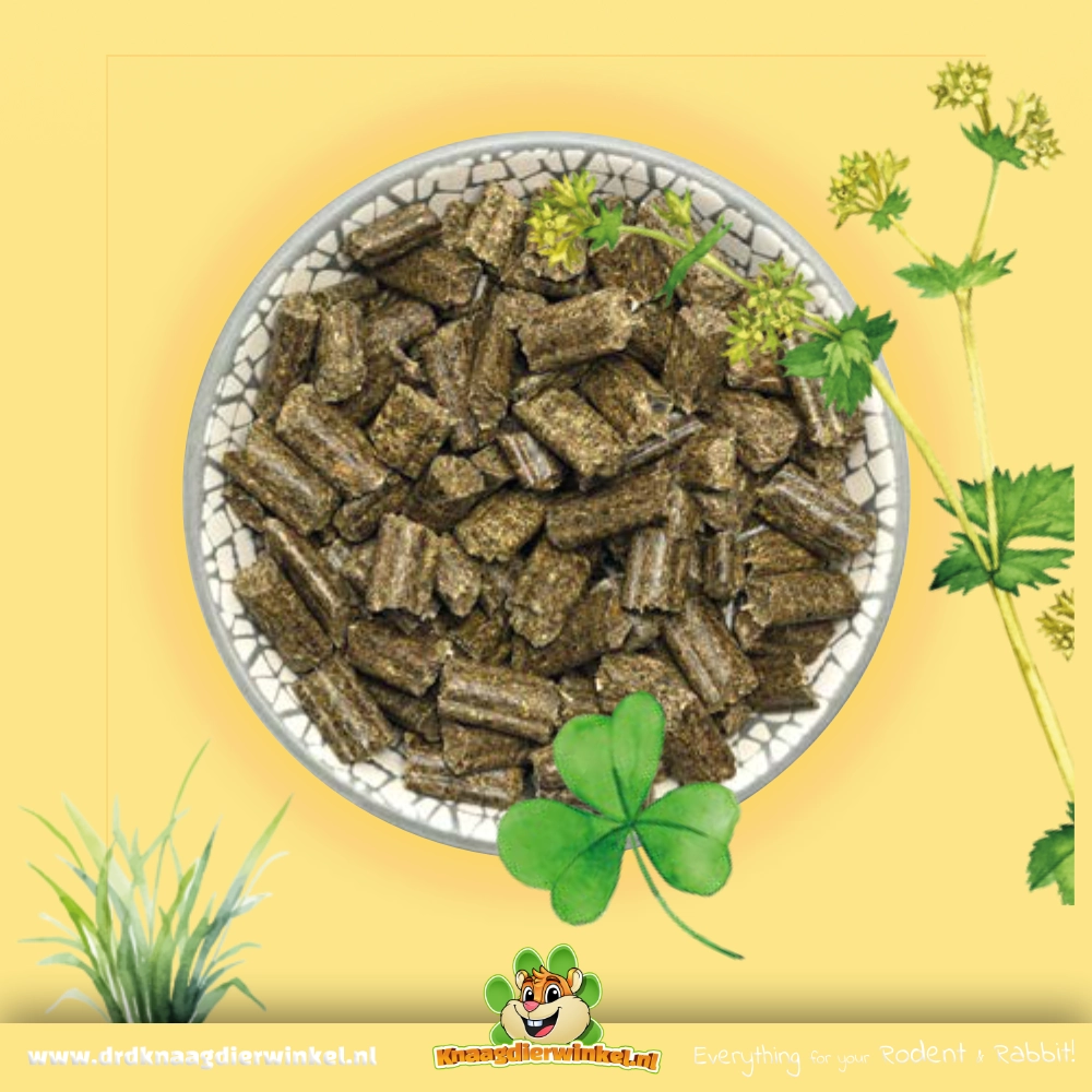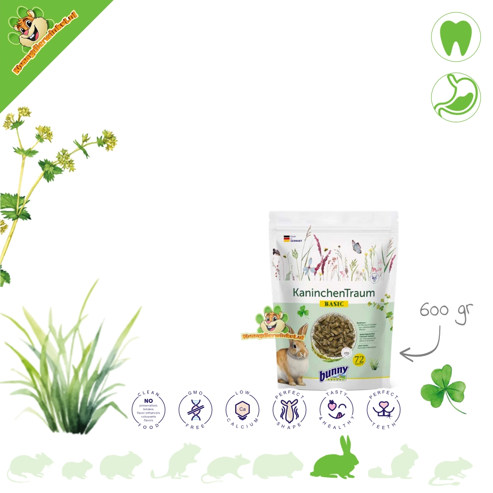 Króliki to zwierzęta obgryzające i skubiące: lubią wielokrotne karmienie i często cenią sobie teksturę. Połączenie szerokiej gamy roślin (63 odmiany) z bogatymi w błonnik składnikami (takimi jak otręby i miąższ) sprawia, że KonijnenDroom BASIC to dobry i stały wybór dla wielu królików w ich codziennej diecie.