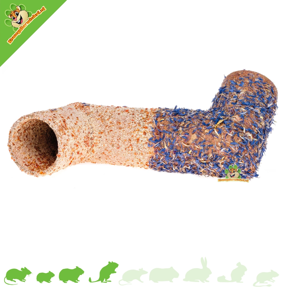 Ta rolka włókien w kształcie narożnika to inteligentne i smaczne urozmaicenie każdego wybiegu dla gryzoni. Tunel może być używany jako część większego systemu tuneli lub umieszczony oddzielnie w rogu wybiegu. Dekoracja ze zdrowych warzyw i kwiatów zachęca zwierzę do gryzienia i eksploracji, co pomaga w walce z nudą i naturalnie ściera zęby. Tunel jest wytrzymały, ma niski zapach i jest całkowicie jadalny - idealny dla małych gryzoni, które lubią być aktywne.