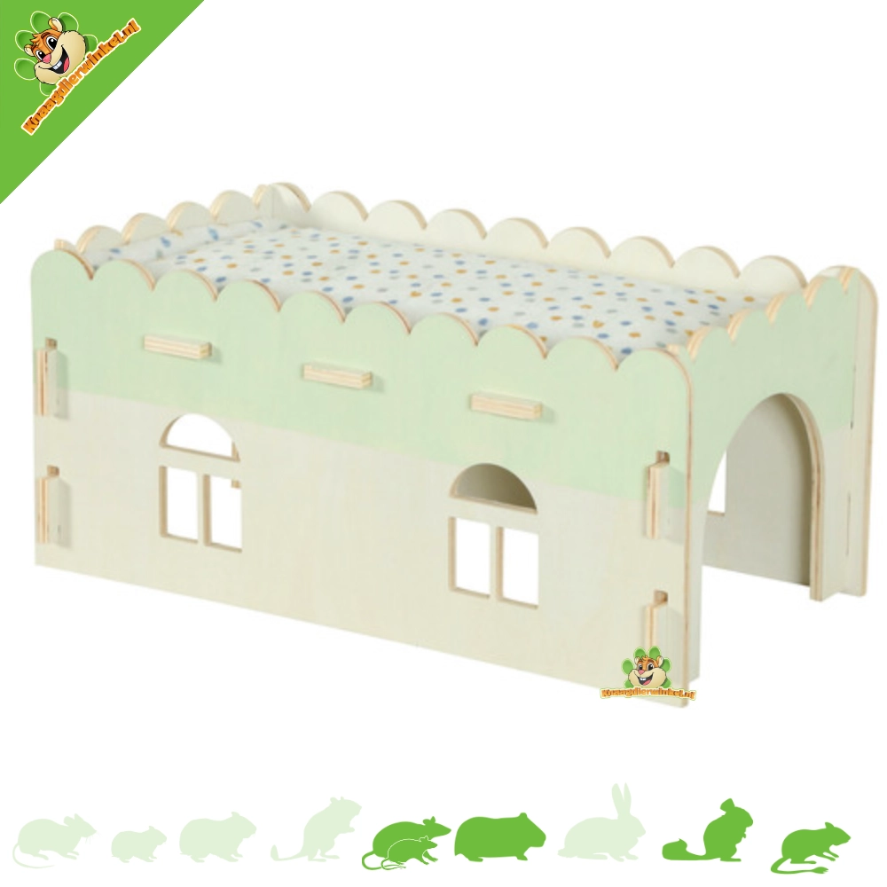 Wytrzymałe drewno topolowe jest łatwe w czyszczeniu i wystarczająco wytrzymałe, aby można je było użytkować codziennie. Połączenie drewna i włókniny zapewnia ciepło i komfort nawet w chłodniejsze dni. Domek jest lekki i łatwy do przenoszenia w obrębie zagrody.